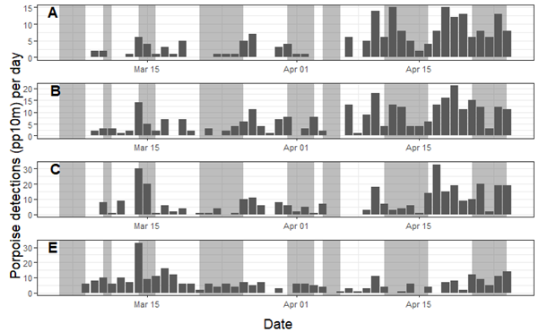 Figure 2: Porpoise detections per day for each recorder location for March/April deployment 2021; A-ASR active periods shown in grey